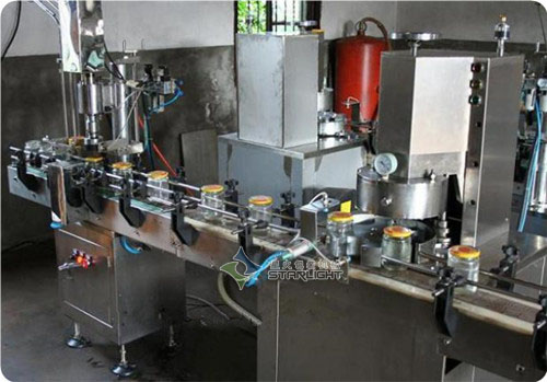 醬料真空封罐機適用于調(diào)味品、罐頭等采用目前最環(huán)保的玻璃瓶包裝,并對瓶內(nèi)真空度有比較高要求的三旋、四旋蓋的玻璃瓶進(jìn)行旋蓋封口(又稱玻璃瓶真空封罐機、玻璃瓶壓蓋機)。本機配上真空系統(tǒng)后,能對玻璃瓶內(nèi)進(jìn)行抽吸真空,以延長瓶內(nèi)容物的保質(zhì)期及口感。連續(xù)工作時可實行自動進(jìn)瓶、自動進(jìn)行抽吸真空、自動旋蓋、自動出瓶,如果配上相關(guān)的氣動控制元件后,還可以實行無蓋不進(jìn)瓶的功能。適用園型及異型的玻璃瓶旋蓋、封口,是目前市場上生產(chǎn)能力最大的抽真空旋蓋機,為各食品廠、罐頭廠作為規(guī)模生產(chǎn)的首選產(chǎn)品。